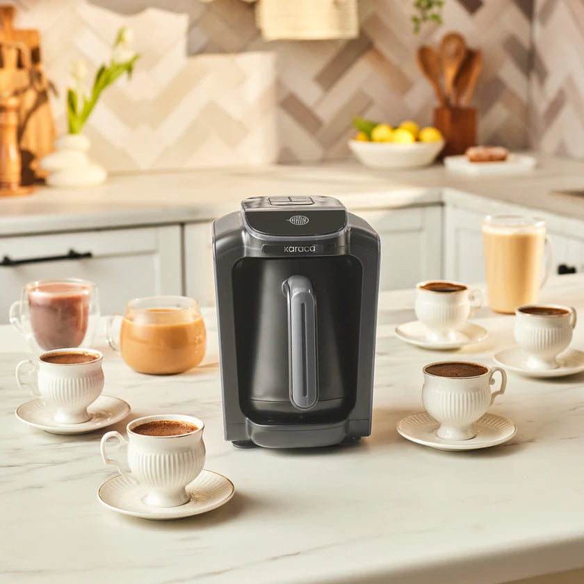 Die Karaca Hatir Neo Türkische Kaffeemaschine mit Milch – Space Grey kombiniert modernes Design mit traditionellem Kaffeegenuss. Als neuestes Modell der Hatir-Serie bereitet sie türkischen Kaffee, türkischen Kaffee mit Milch, Kaffee nach Glut-Art (Közde) sowie heiße Schokolade mit Milch bequem in nur einem Gerät zu.