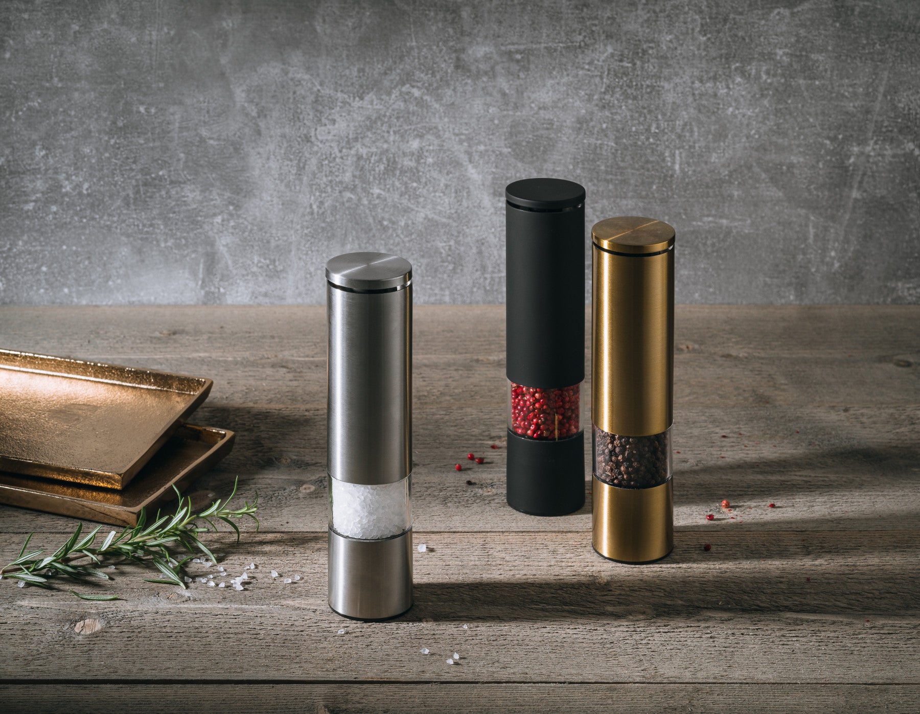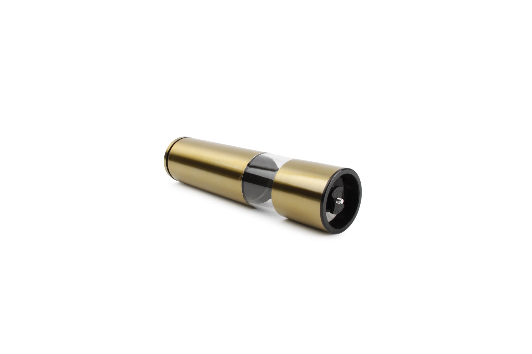 Salzmühle und Pfeffermühle Space in elegantem Gold - ausgestattet mit hochwertigem Mahlwerk für präzises Würzen und edles Design.
