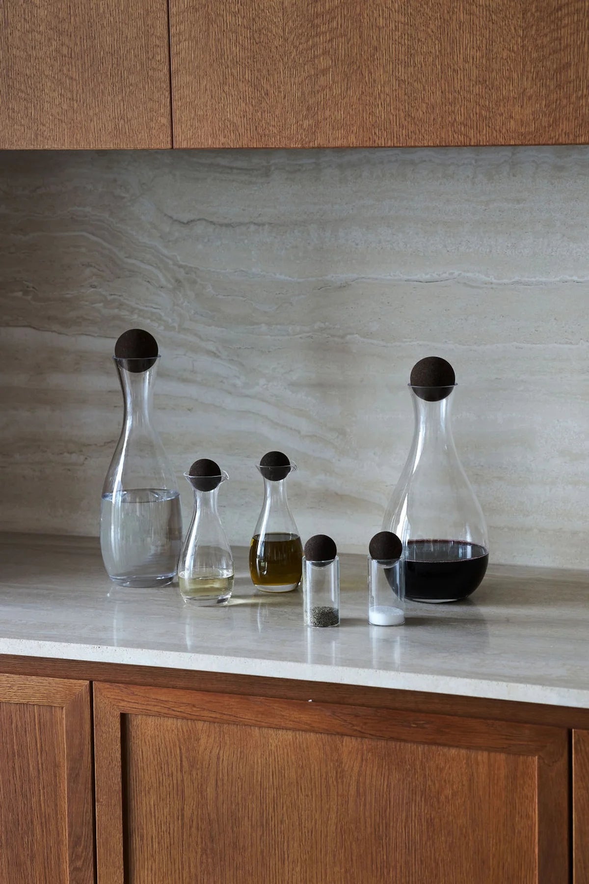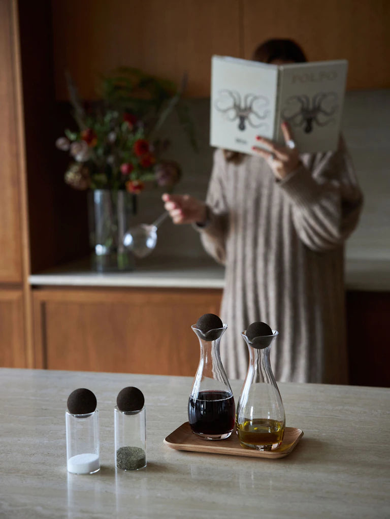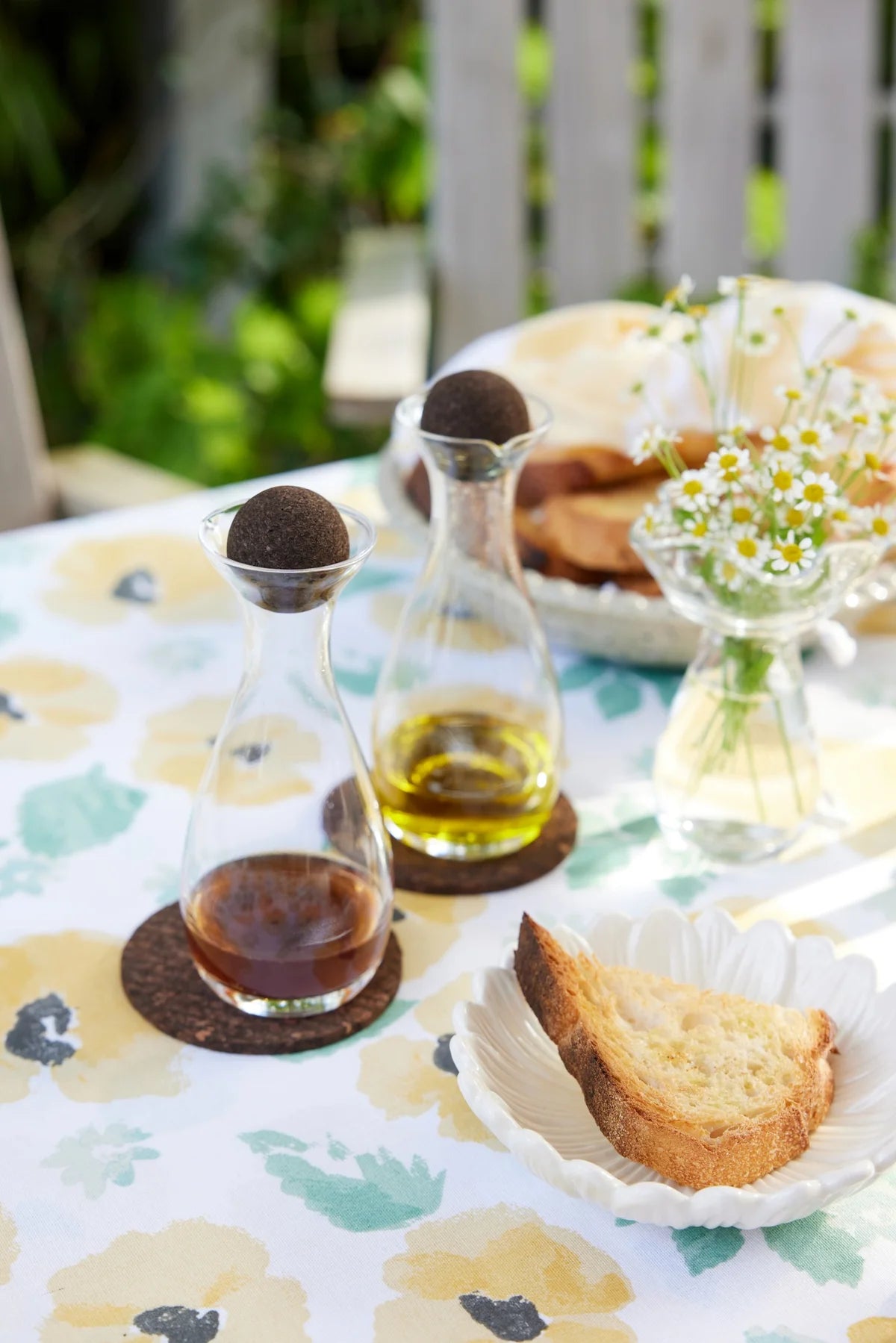 Elegante Essig- und Ölflasche aus mundgeblasenem Glas mit Korkdeckel – eine stilvolle Kombination aus natürlicher Wärme und filigraner Handwerkskunst für Tisch und Küche.