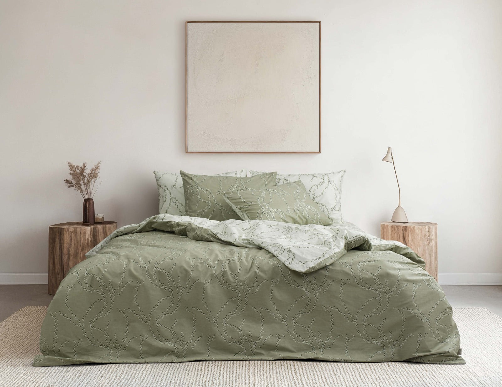 Das Rin Forest-Grün Bettwäsche-Set aus 100 % reiner Baumwolle überzeugt durch seine natürliche Farbgebung und hohe Qualität. Die weiche, atmungsaktive Baumwolle sorgt für ein frisches Schlafklima und verleiht deinem Schlafzimmer einen modernen, harmonischen Look.