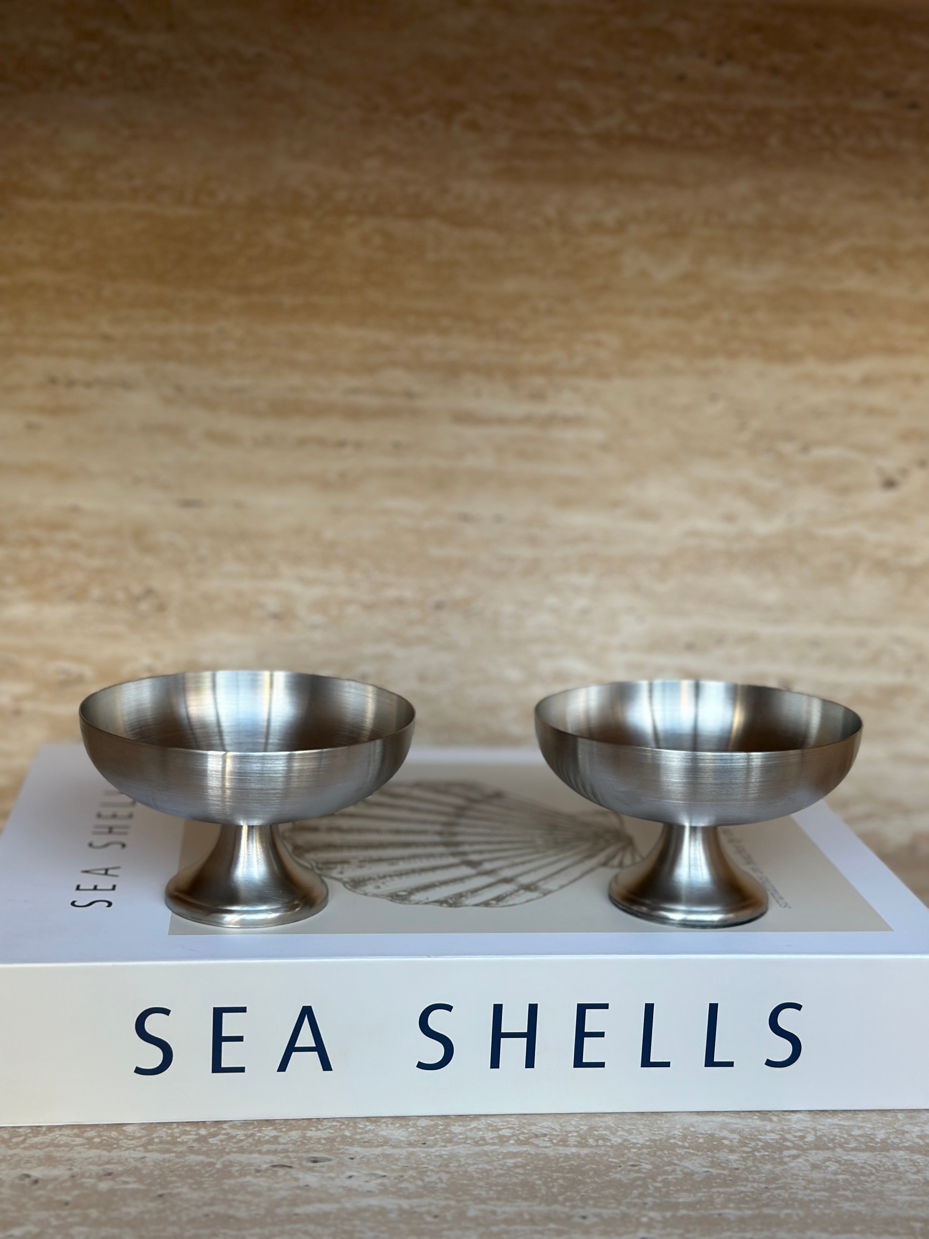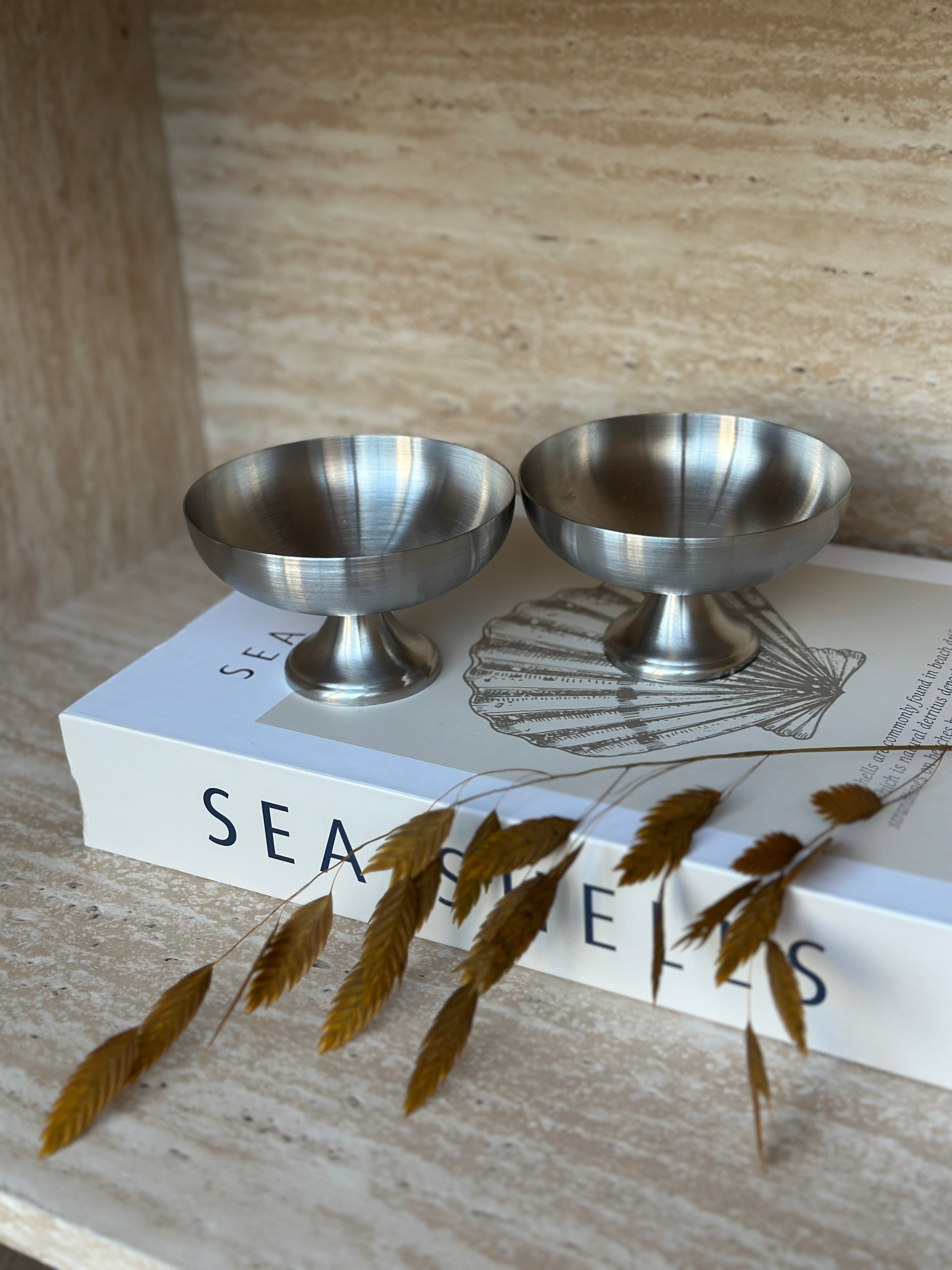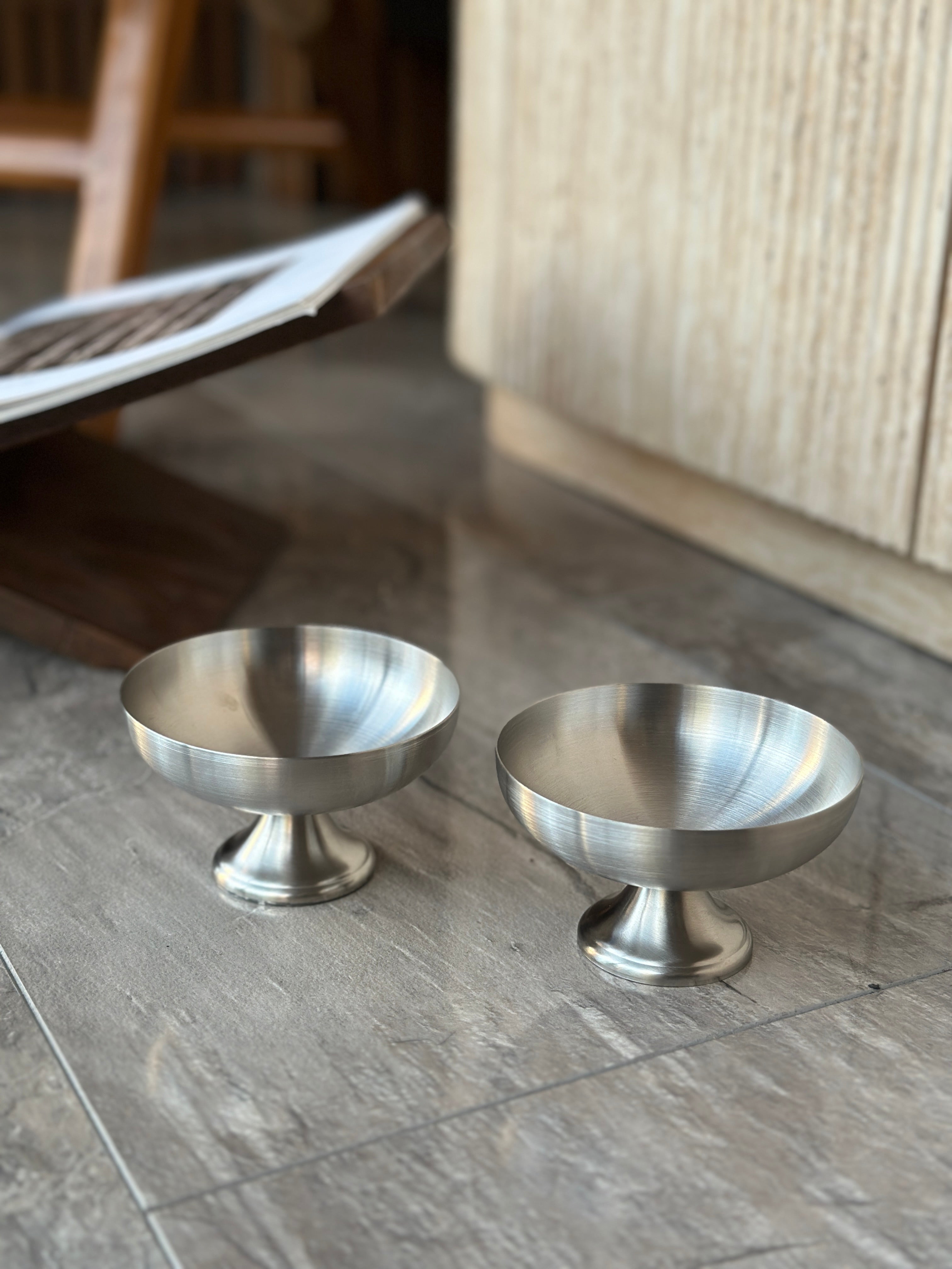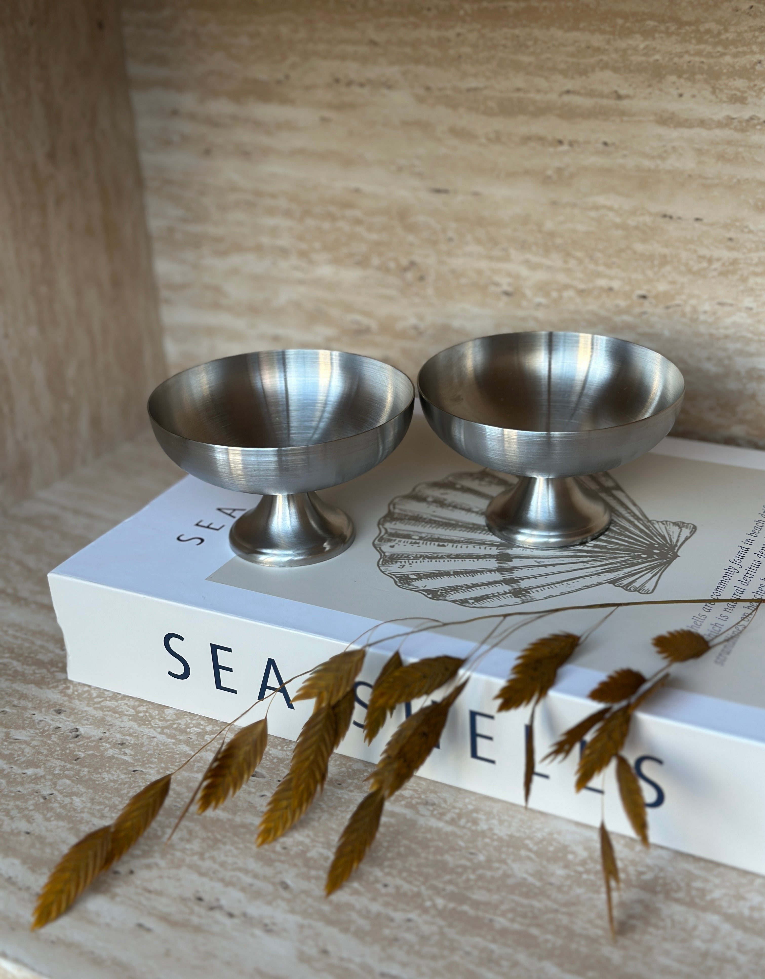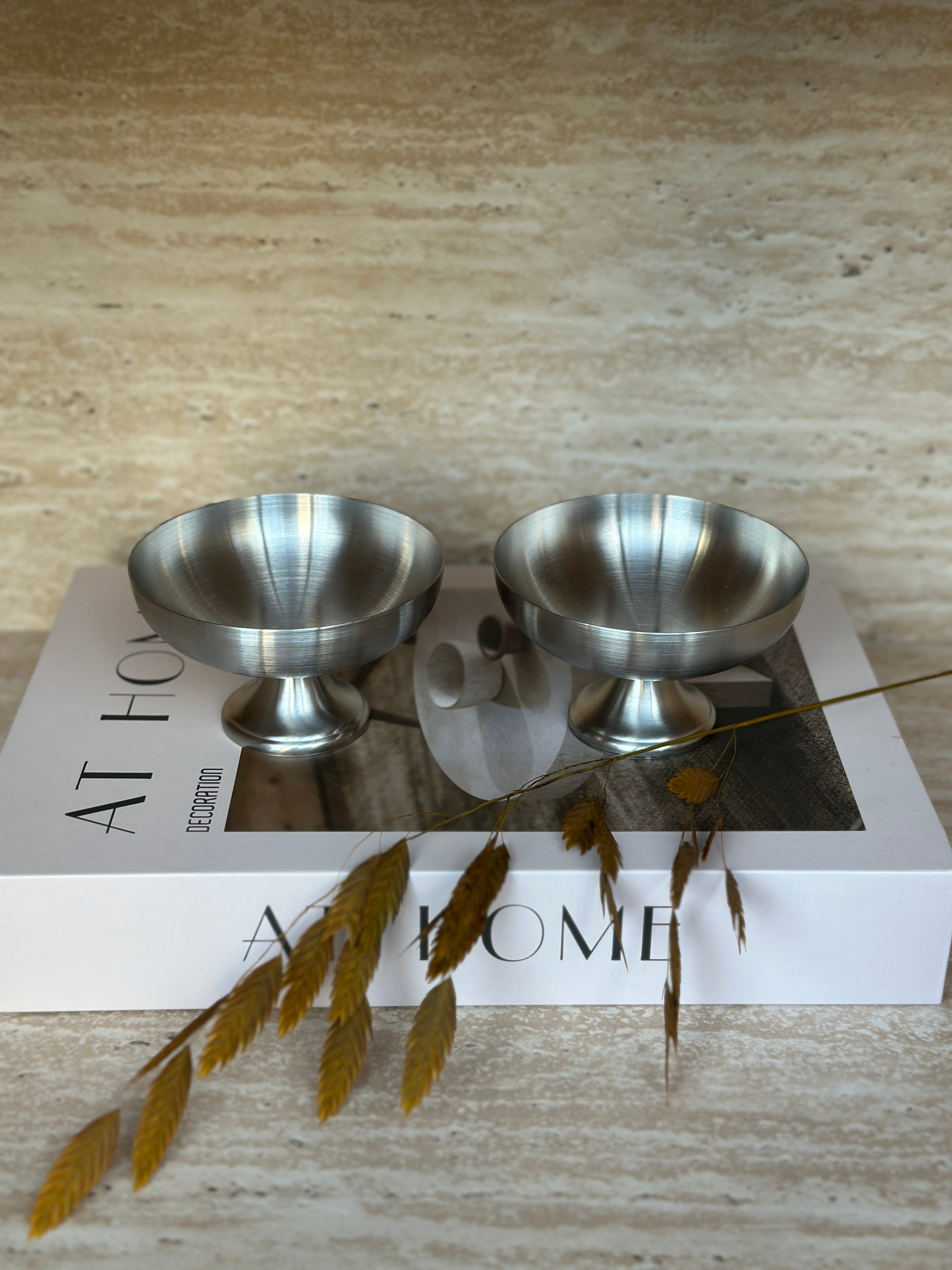 Das Aura 2er Dessertschale Set auf Fuß bringt mit seinem minimalistischen Design schlichte Eleganz auf Ihren Tisch. Ideal für Desserts, Eis, Oliven, Kirschen und verschiedene Snacks – perfekt für den Alltag sowie für besondere Anlässe. Die hochwertige Edelstahl-Optik und das stilvolle Fußdesign sorgen für eine moderne und edle Präsentation.