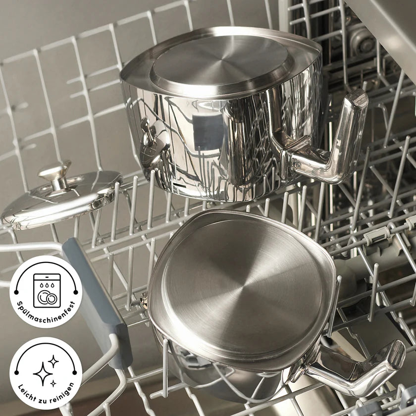Das Teekannen-Set ist spülmaschinengeeignet. Für eine besonders lange Lebensdauer empfehlen wir eine Reinigung mit mildem Spülmittel und einem weichen Schwamm. Bitte keine scheuernden Reinigungsmittel oder kratzenden Materialien verwenden, um die Edelstahloberfläche dauerhaft glänzend zu erhalten.