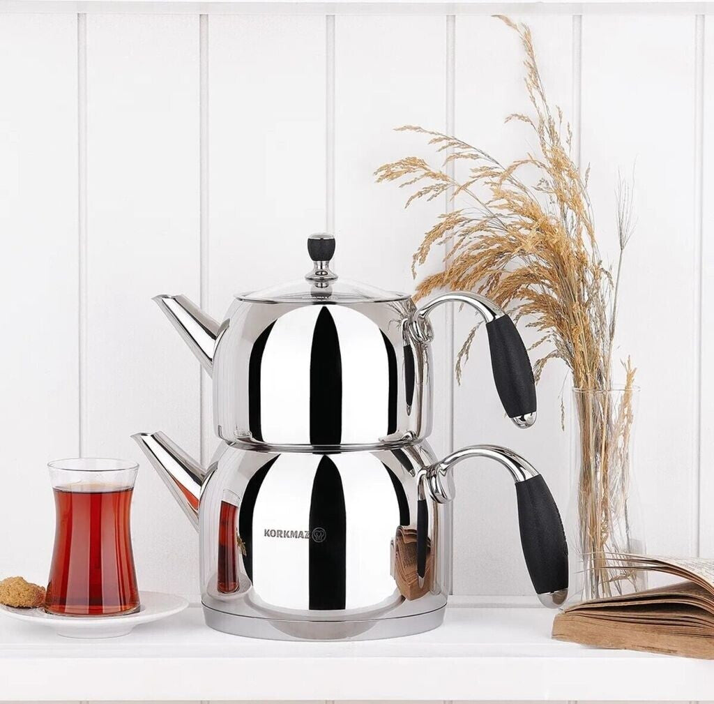 Korkmaz Flora Maxi A119 Teekanne aus Edelstahl (18/10) für Induktion. Modernes Design mit hitzebeständiger Glasabdeckung – perfekt für 1,1 l oder 2,0 l Tee.