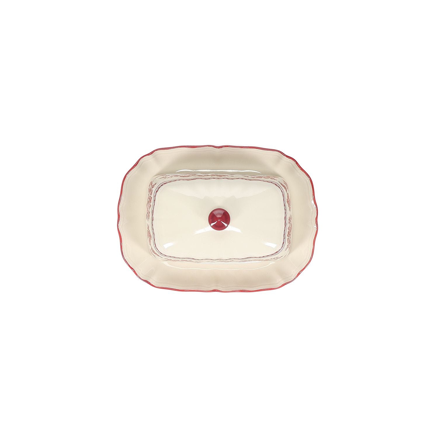 Lernen Sie die 20x14,5xH8,5cm große burgunderrote Butterdose aus der Cyril-Kollektion kennen. Gefertigt aus feinem Porzellan, vereint sie Vintage-Charme mit modernem Flair. Ideal, um Butter stilvoll bei Abendessen zu Hause oder eleganten Partys zu servieren. Ein Muss für Liebhaber des Retro-Designs.