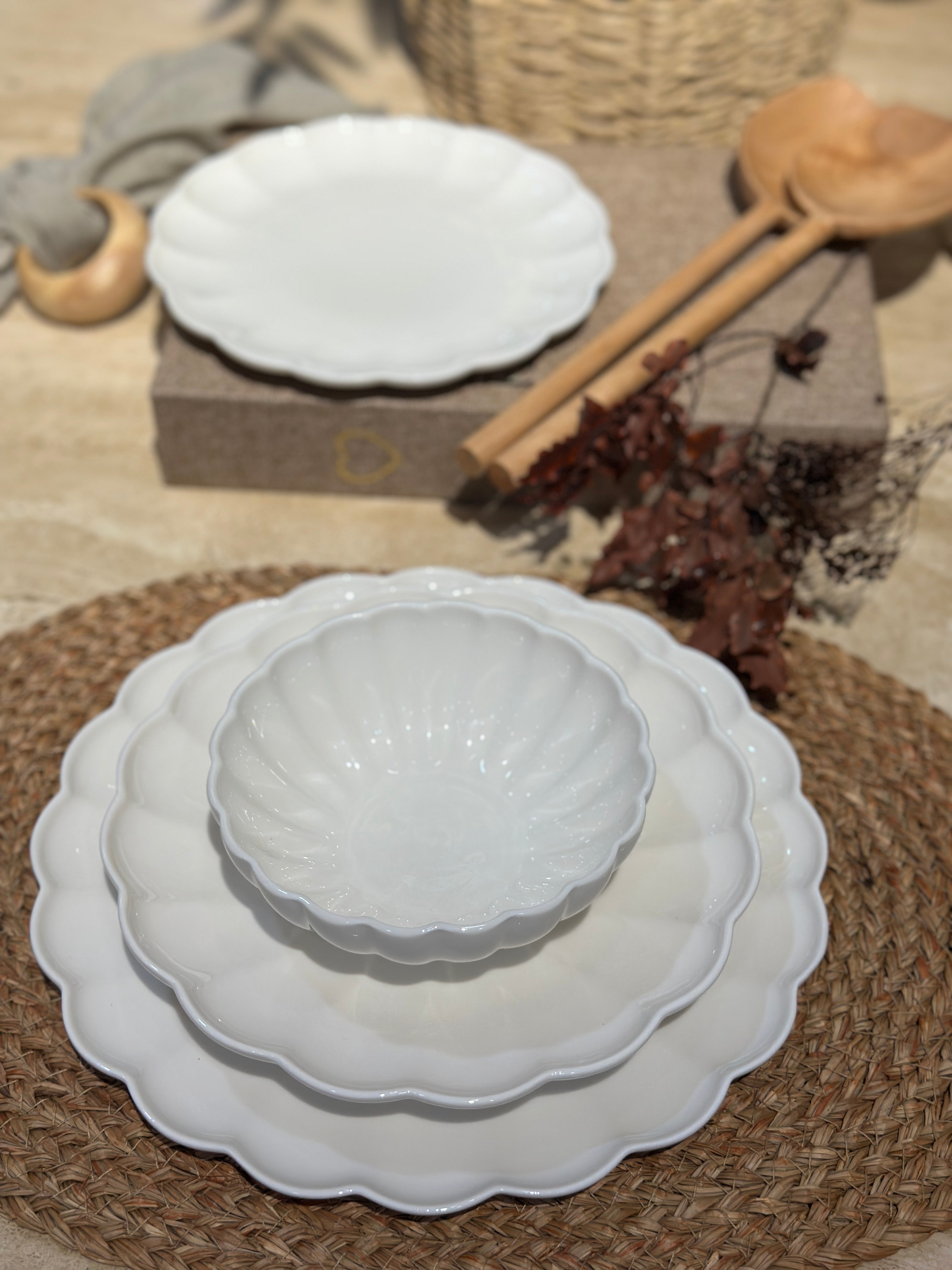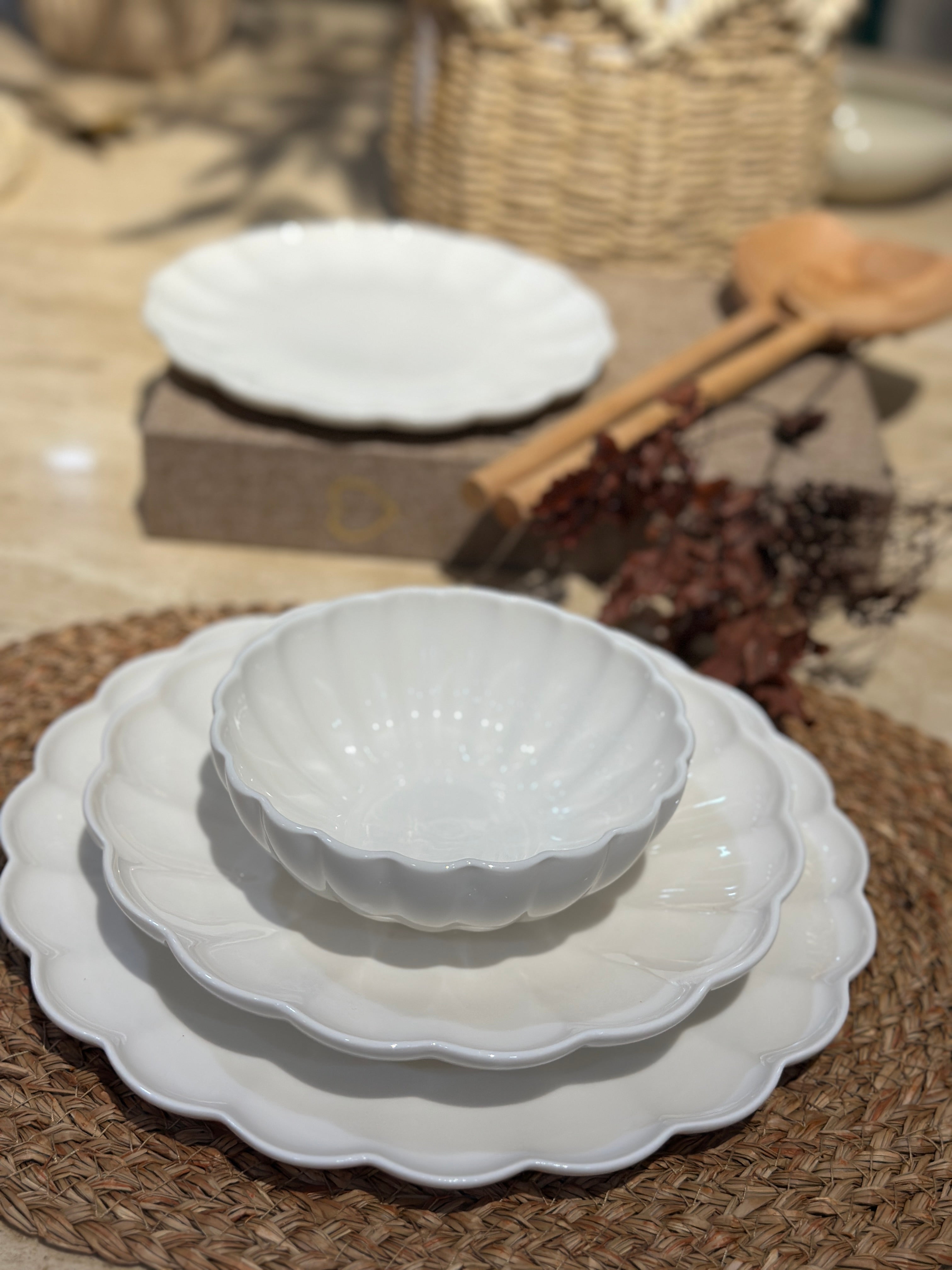 Elegantes 24-teiliges Lotus Geschirrset aus weißem Porzellan. Bestehend aus Serviertellern, Desserttellern, tiefen Tellern und Suppenschale – perfekt für Alltag und besondere Anlässe.