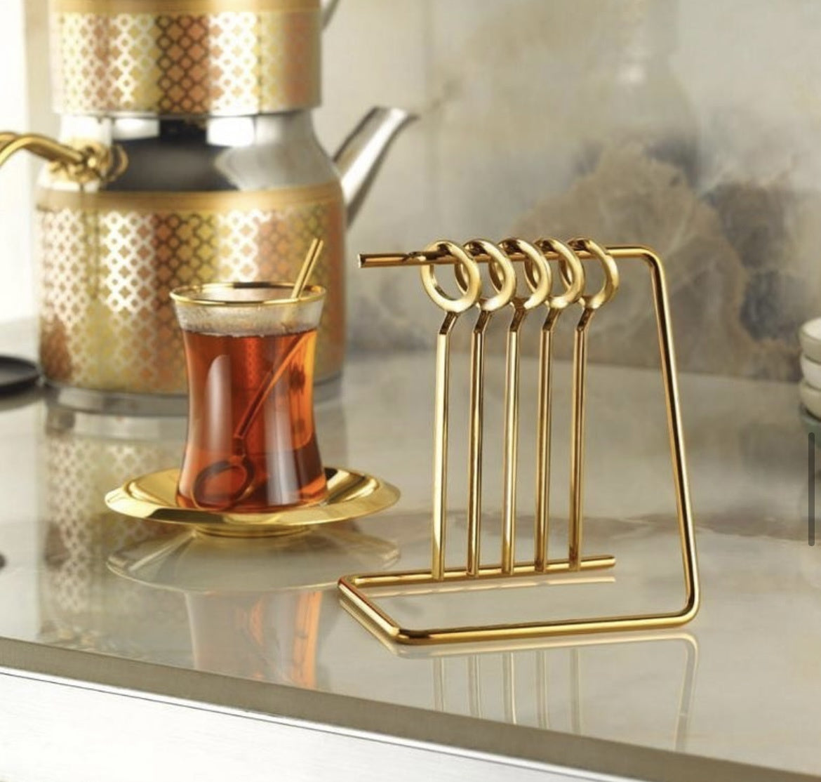 Die Oslo Gold Teelöffel mit Ständer verbinden luxuriöses Design mit praktischer Aufbewahrung – das elegante Set ist ein stilvoller Hingucker auf jedem Tisch und ideal für Kaffee, Tee oder Desserts.