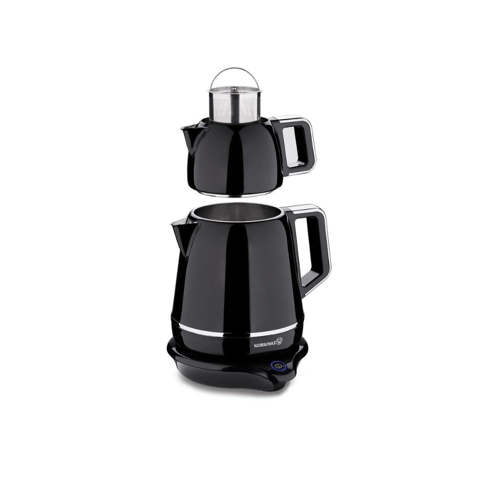 Korkmaz Demirs siyah krom elektrikli çaydanlık. Modern ve kompakt tasarımıyla suyu ve çayı hızla kaynatır.